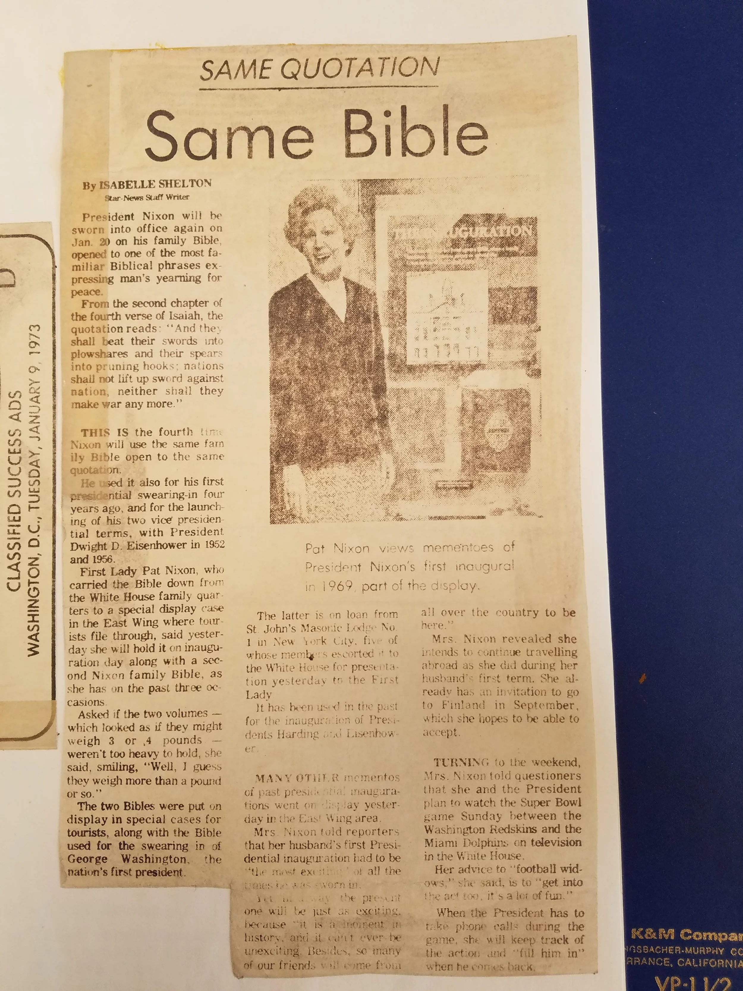 President Richard M. Nixon used his family Bible four times; twice as President and twice as Vice-President. In 1973, however, First Lady Pat Nixon requested that the George Washington Inaugural Bible be put on display at the White House during the Inaugural ceremonies and had the Bible owned by St. John's Lodge No. 1 AYM in New York next to the Nixon family Bible.