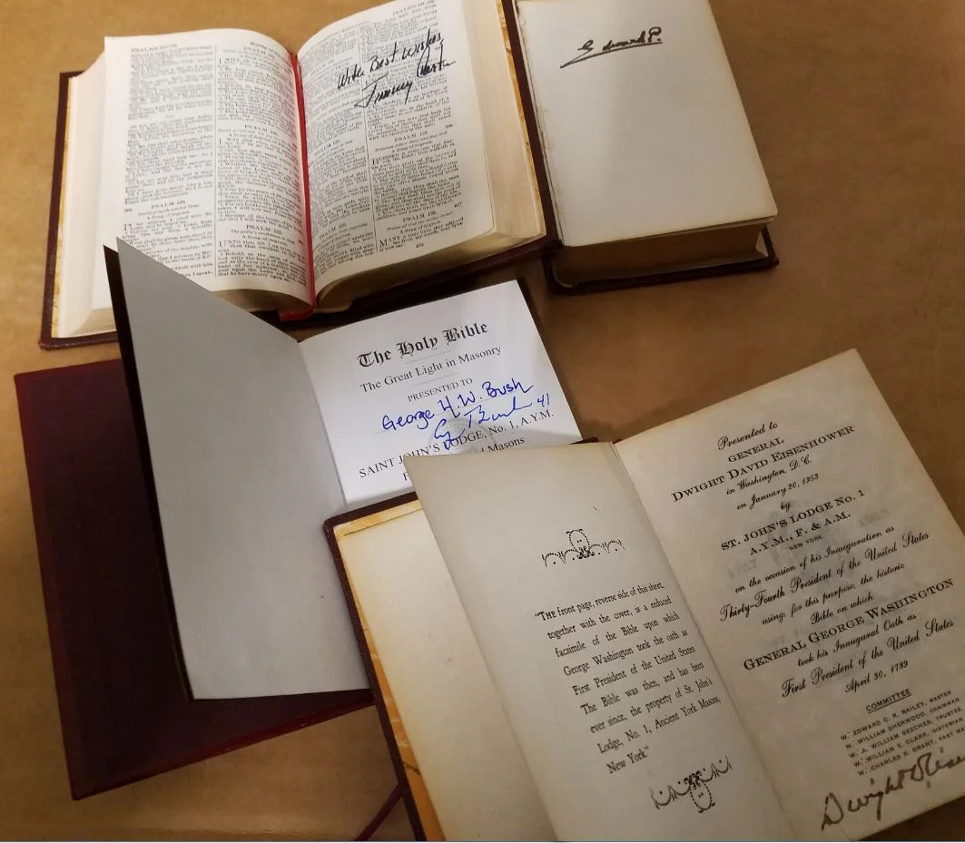 This is an exact replica of the George Washington Inaugural Bible in a smaller size. The Lodge has been producing these for over 100 years in a similar format and many have been signed by Presidents and Kings of England and are in possession of the Lodge.